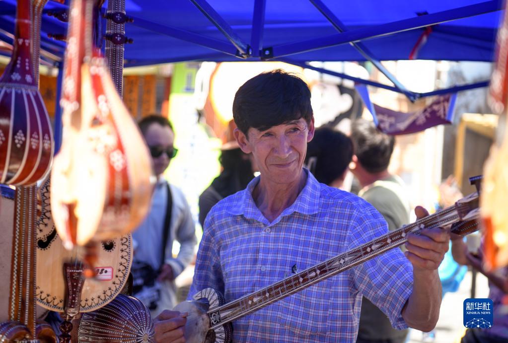 6月9日,在烏魯木齊大巴扎景區(qū),民族樂(lè)器制作傳承人艾爾肯·吐么爾在活動(dòng)現(xiàn)場(chǎng)彈奏熱瓦甫。
