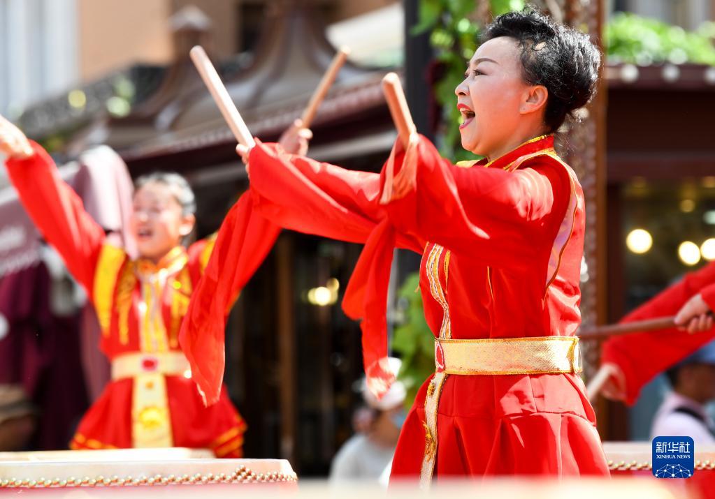 6月9日,在烏魯木齊大巴扎景區(qū),烏魯木齊市米東區(qū)三道壩鎮(zhèn)社火隊(duì)演員在活動現(xiàn)場表演。