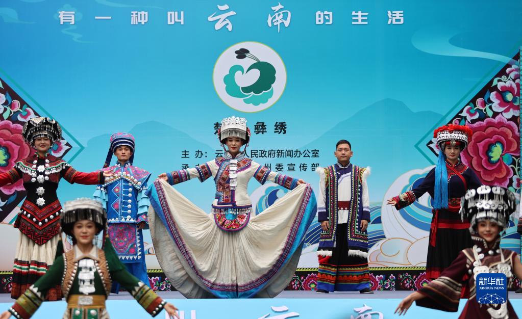 6月9日,模特在云南省楚雄市彝人古鎮活動現場展示刺繡服飾。