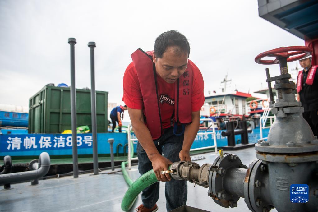 6月8日,工作人員通過管道接收船舶生活污水。