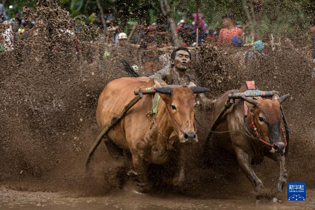 6月3日,在印度尼西亞西蘇門答臘省,一名男子在水稻田里參加傳統(tǒng)的奔牛比賽。