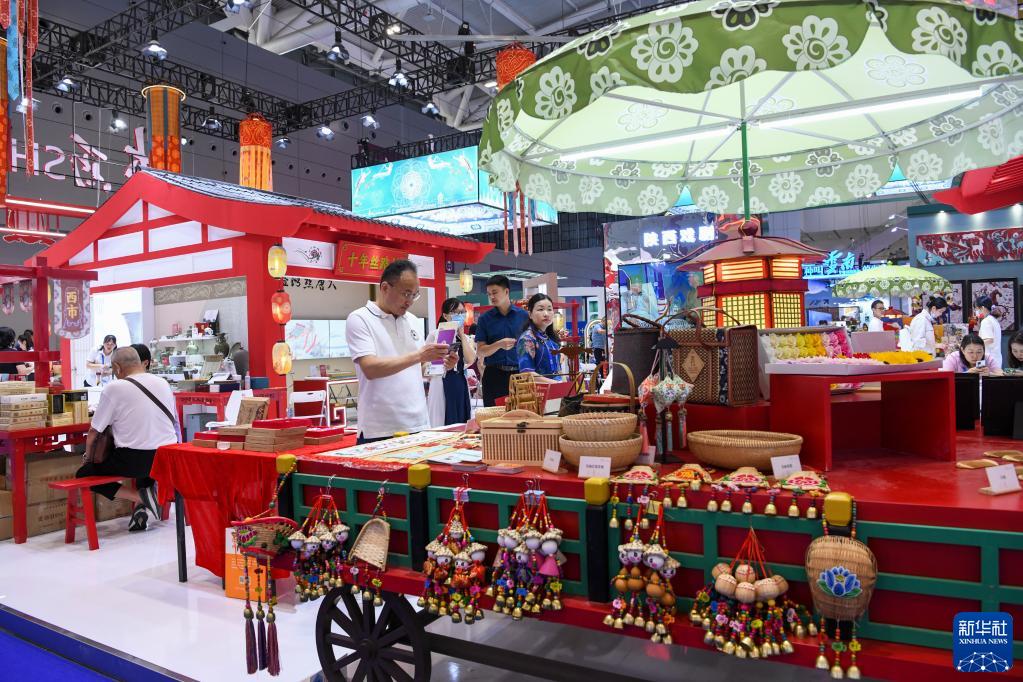 6月9日,在文博會“文旅消費館·一帶一路國際館”陜西展臺,觀眾瀏覽選購特色商品。