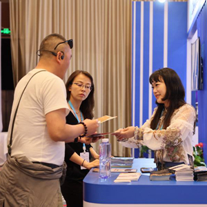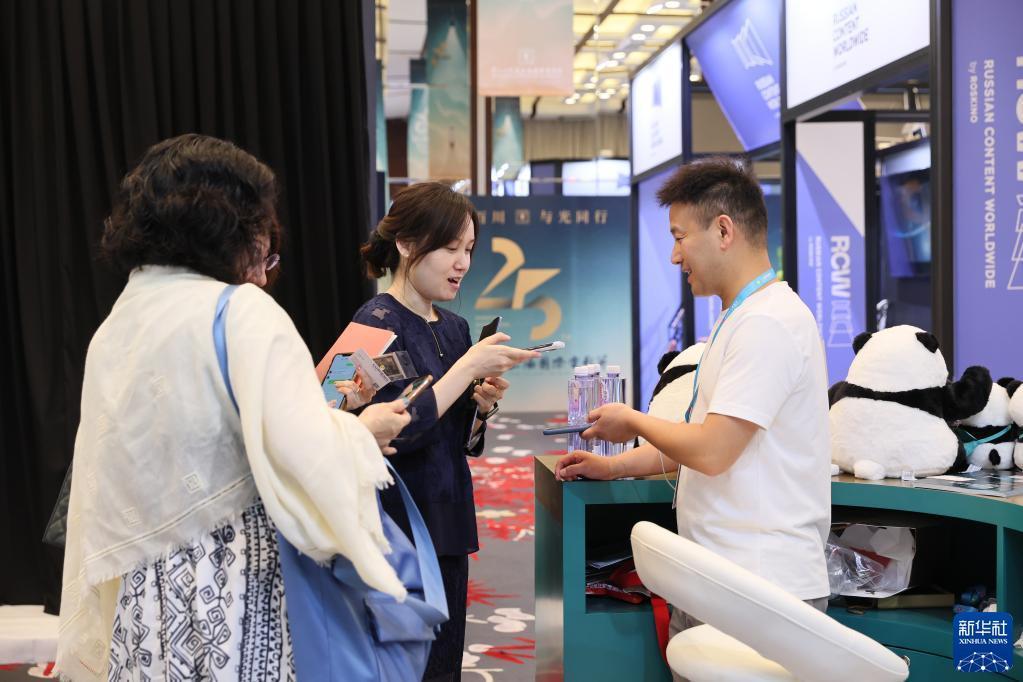 6月10日,展商在電影市場與咨詢者交換聯系方式。