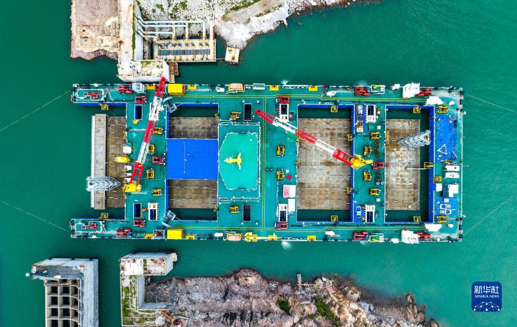 “一航津安1”號沉管運輸安裝一體船拖帶E23管節和最終接頭從珠海桂山島啟航,前往沉放水域(6月8日攝,無人機照片)。