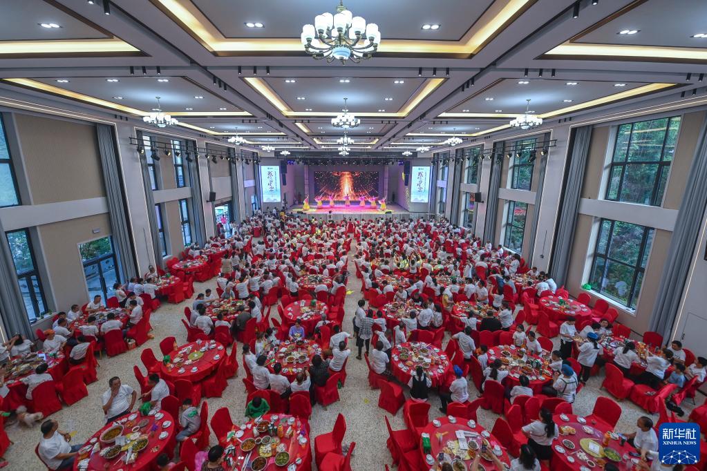 浙江建德市新安江街道梅坪村村民在村文化禮堂內(nèi)參加百家宴并觀看文藝演出(5月27日攝)。