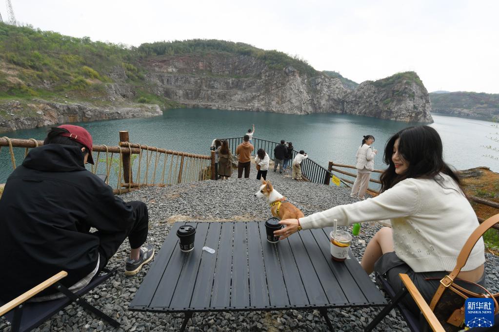 游客在浙江湖州市安吉縣梅溪鎮(zhèn)紅廟村一家建于廢棄礦坑旁的咖啡館休閑(4月7日攝)。