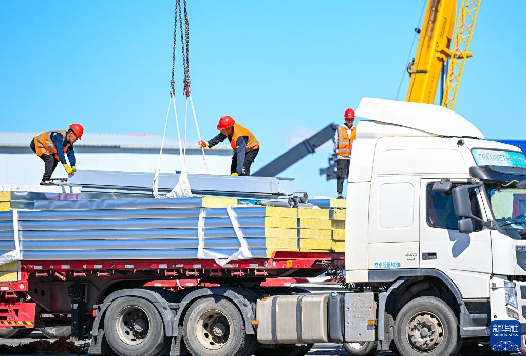 6月11日,工人在二連浩特口岸旁的進出口物流園區中裝載準備出口的貨物。