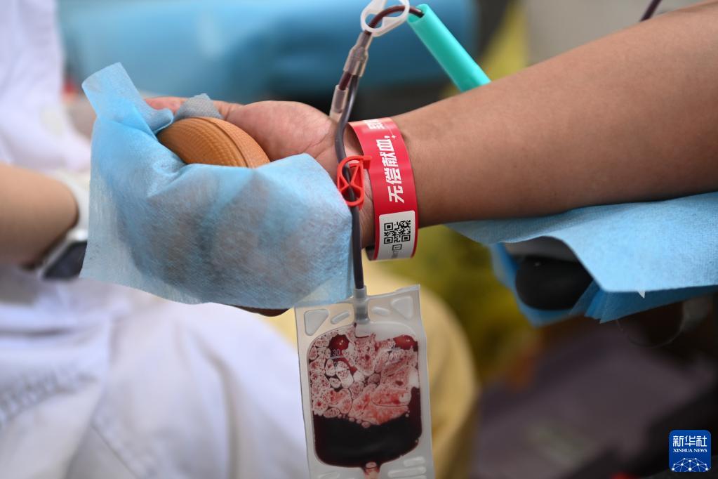 6月11日,青年志愿者在獻(xiàn)血車(chē)上無(wú)償獻(xiàn)血。