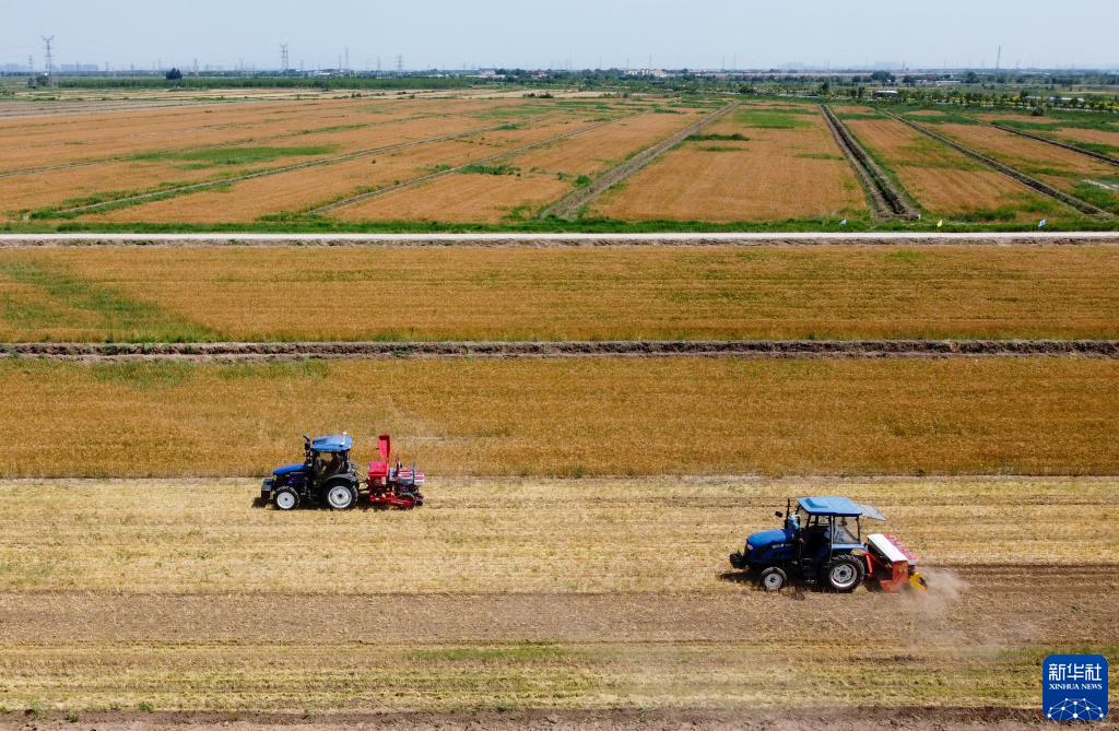 6月11日,在天津市靜海區蔡公莊鎮,農機在收割完小麥的土地上進行玉米播種(無人機照片)。