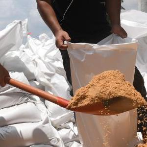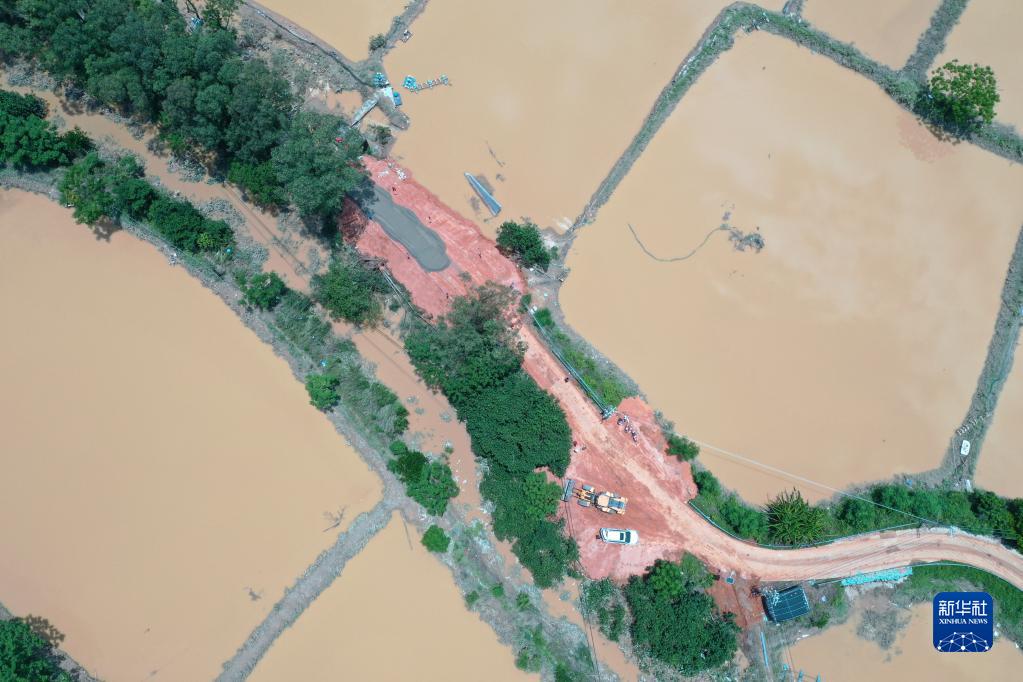 6月11日,在廣西合浦縣白沙鎮(zhèn),工人在施工修復(fù)遭洪水損毀的堤壩(無人機(jī)照片)。