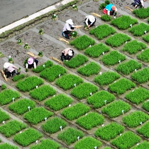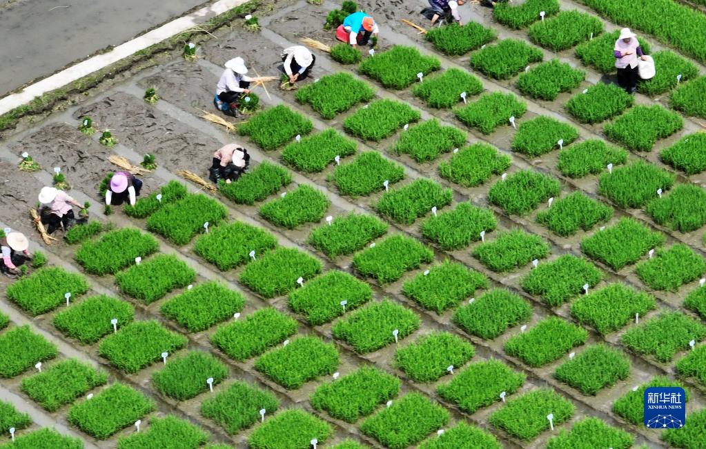 6月11日,在江蘇里下河地區農科所(揚州市農科院),農民在試驗田里起秧苗(無人機照片)。