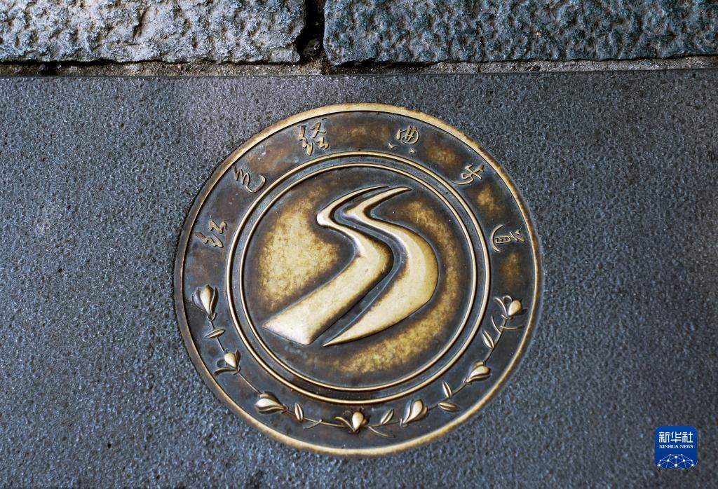 6月9日在上海市黃浦區的道路上拍攝的“紅色經典步道”標識。通過這條步道,市民游客以中共一大會址為起點,可以漫步至周邊的多處紅色舊跡遺址,展開紅色之旅。
