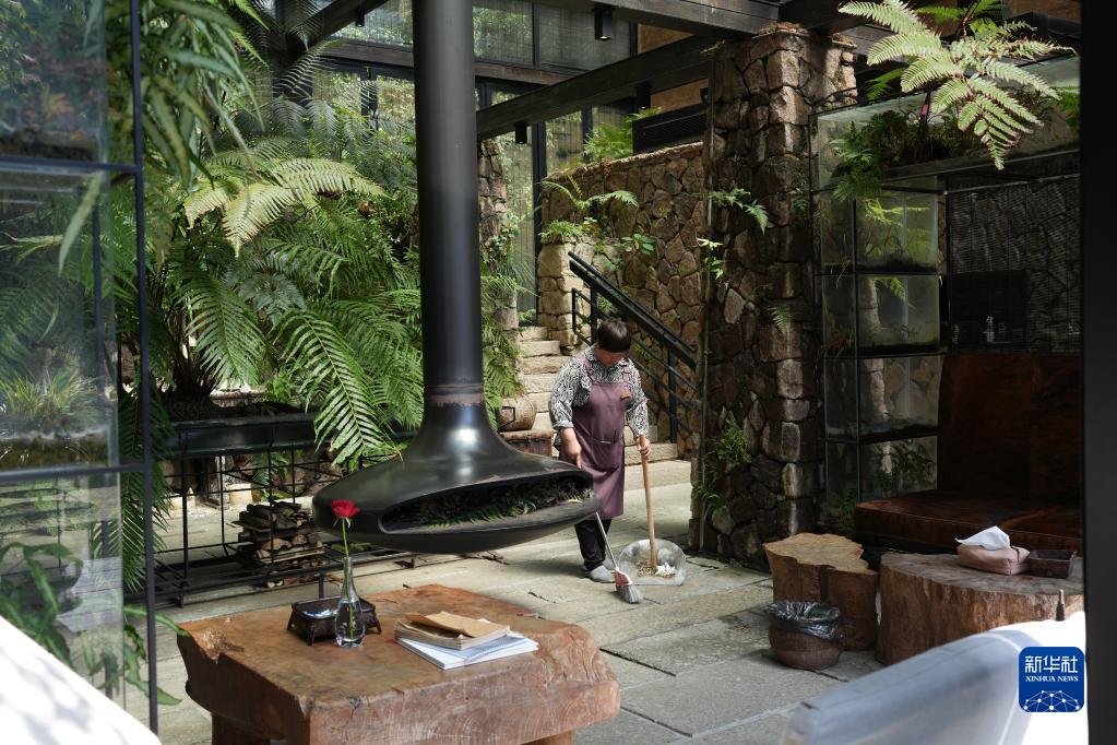 工作人員在浙江金華浦江縣虞宅鄉(xiāng)一家由古村落改建的民宿內打掃(5月23日攝)。