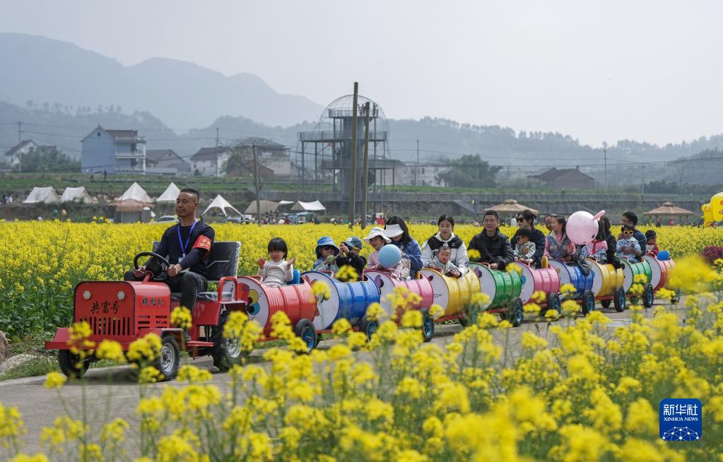 在浙江杭州臨安區青山湖街道郎家村“共富稻田”,游客乘坐田野小火車在油菜花地里感受春日美景(4月1日攝)。“共富稻田”定位多功能田園農旅綜合體,陸續打造了妙哉花園、稻田觀光道、稻田餐廳、稻田茶吧等鄉村旅游特色節點,吸引城市居民前來體驗戶外農田生活。