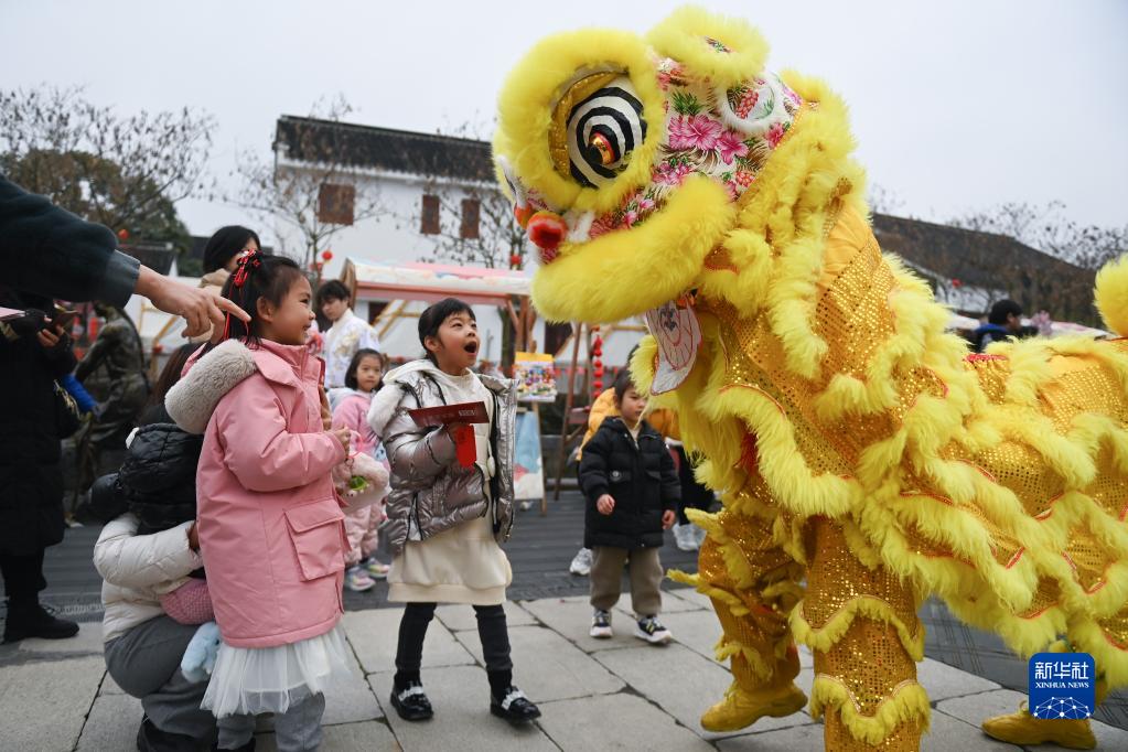 游客在浙江湖州吳興區八里店鎮潞村觀看舞獅表演(2月5日攝)。