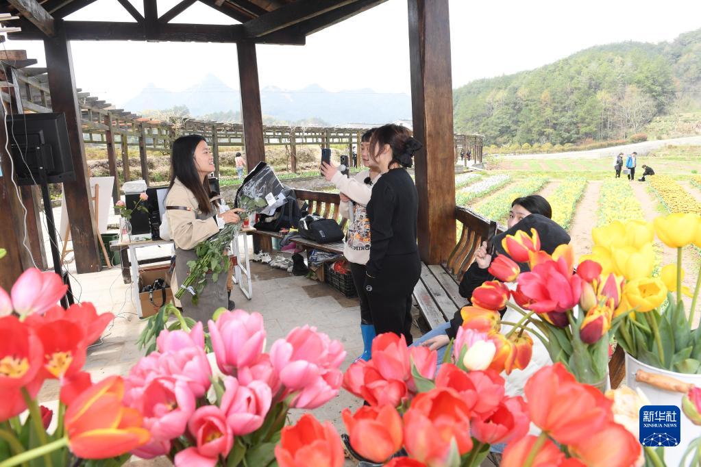 主播在浙江金華浦江縣杭坪鎮烏漿村的花海間直播賣花(3月28日攝)。
