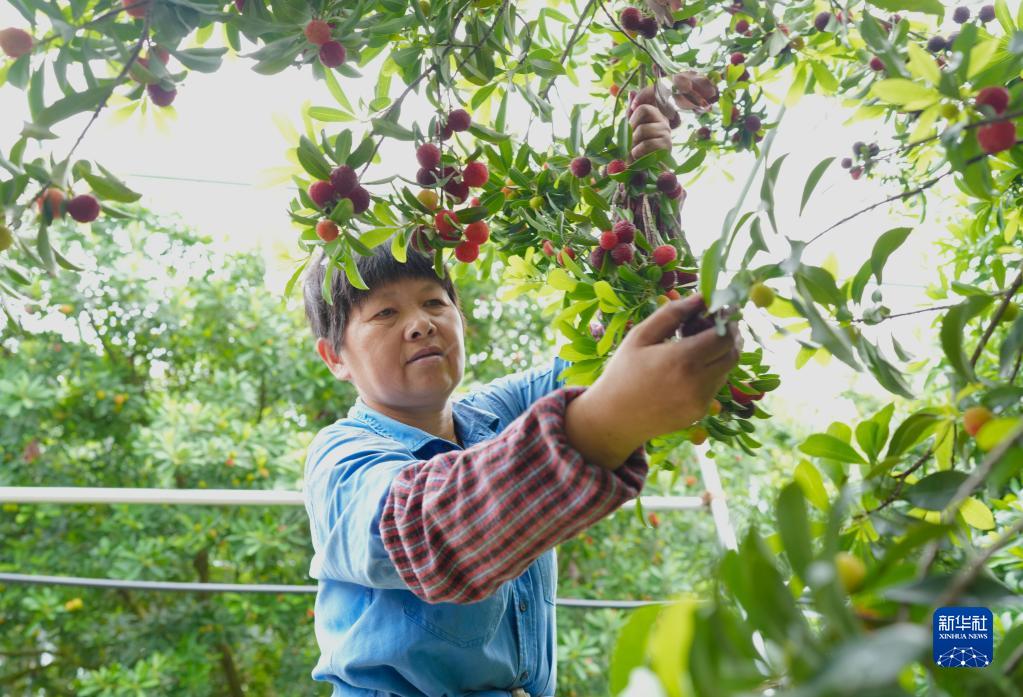 在浙江余姚三七市鎮(zhèn),果農(nóng)陳利平在采摘楊梅(6月1日攝)。她和丈夫鄭通海在承包的楊梅山上建起保溫大棚,上市時(shí)間比露天楊梅提前不少。