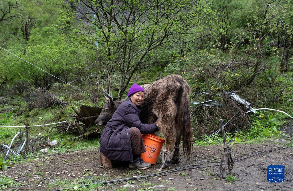 6月10日,央宗在牧場擠奶。