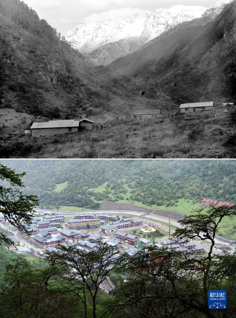 這是一張拼版照片。上圖為1997年9月拍攝的玉麥鄉(xiāng)(新華社記者索朗羅布攝);下圖為2023年6月10日拍攝的玉麥鄉(xiāng)(新華社記者費(fèi)茂華攝)。