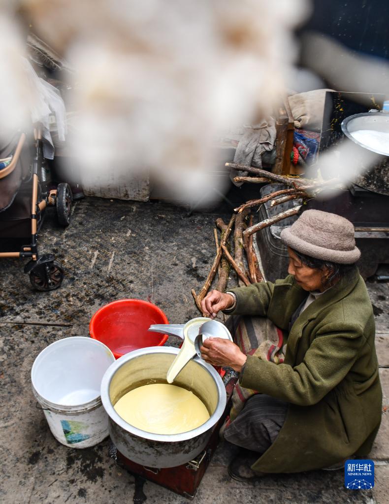 卓嘎在牧場的小屋里制作酥油(6月10日攝)。