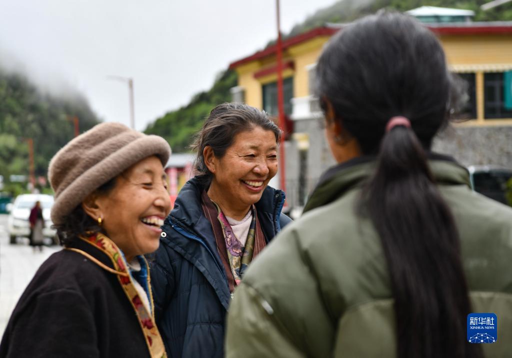 卓嘎(左)和央宗在玉麥鄉(xiāng)街頭與人聊天(6月10日攝)。