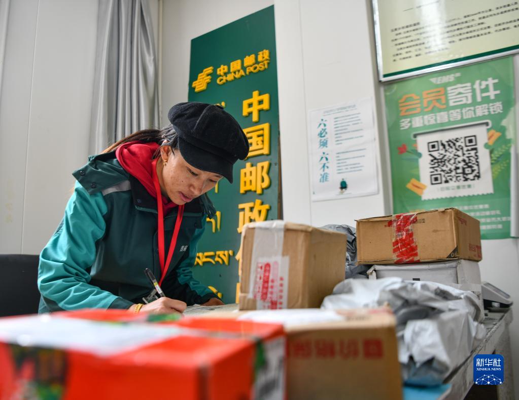 玉麥鄉郵政營業員索朗卓嘎在登記快遞郵件(6月10日攝)。