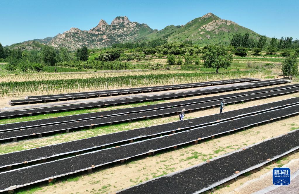 6月12日,河北省秦皇島市撫寧區(qū)墳坨鎮(zhèn)舊縣村的農(nóng)民在晾曬用作藥材的桑葚(無人機照片)。