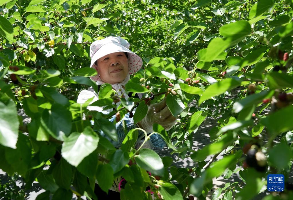 6月12日,河北省秦皇島市撫寧區(qū)墳坨鎮(zhèn)舊縣村一家桑葚合作社的社員在采摘桑葚。