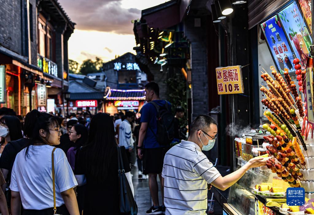 6月10日,人們?cè)诒本┦矂x海附近的煙袋斜街買小吃。新華社記者 陳鐘昊 攝