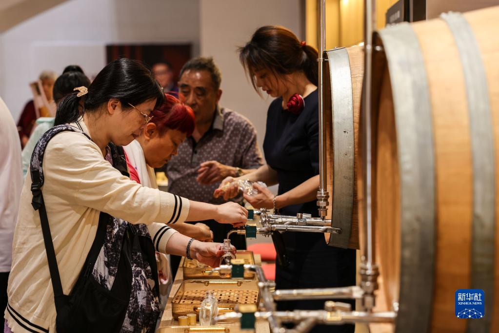 6月12日,游客在張?jiān)>莆幕┪镳^內(nèi)體驗(yàn)灌裝白蘭地酒。