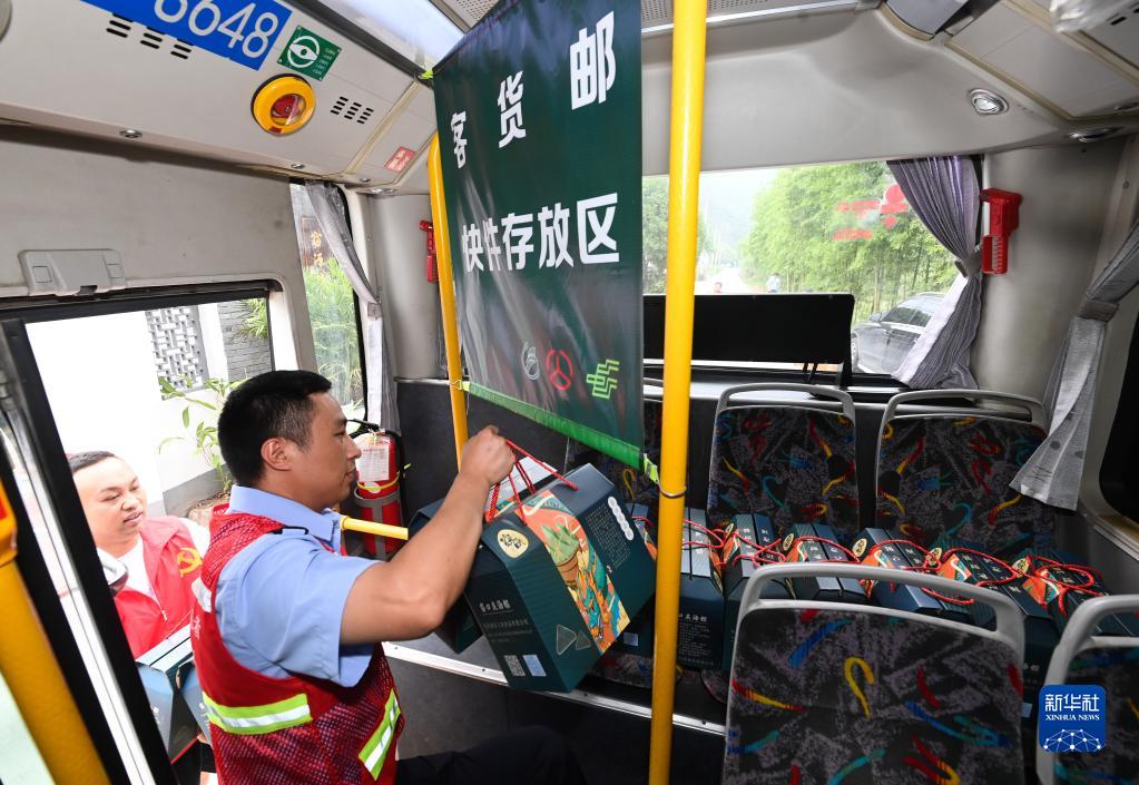 6月13日,在杭州市富陽區湖源鄉窈口村的“源享共富工坊”外,當地交通部門的黨員志愿者將灰湯粽禮盒裝上“客貨郵”專線,銷往外地。富陽區以城鄉公交為載體的客貨郵融合專線,著力解決快遞下鄉、農產品進城問題,打通城鄉物流末端,實現資源共享、城鄉共富。