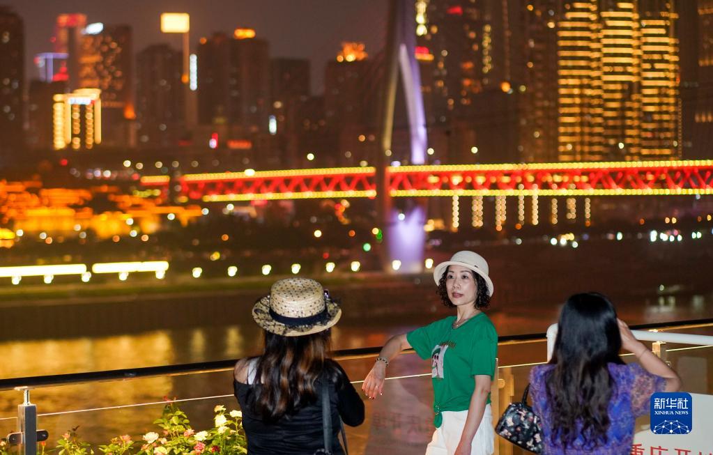 6月9日,重慶開埠遺址公園的觀景平臺上,游客們在打卡拍照。