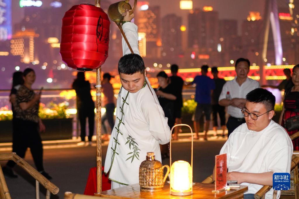 6月9日,重慶開埠遺址公園的觀景平臺上,游客們在一邊欣賞重慶夜景,一邊感受茶藝表演。