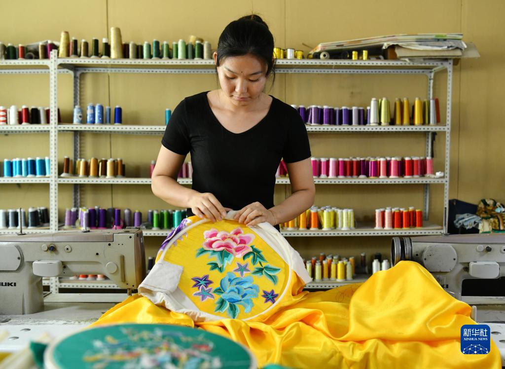 6月13日,河北省肅寧縣邵莊鄉東高家口村一家戲曲服裝廠的工人在繡制戲曲服裝。