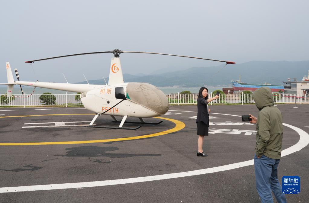 6月12日,游客在強蛟鎮一架觀光直升機前留影。