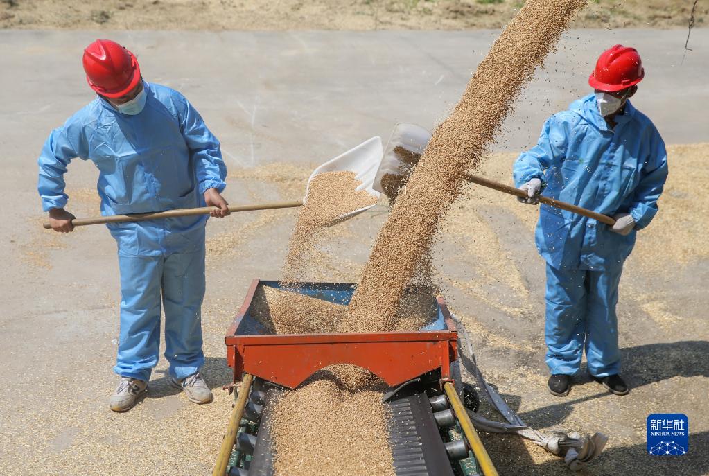 6月13日,在江蘇連云港市青口鹽場倉儲中心,工人用傳輸機傳送烘干后的小麥入庫。