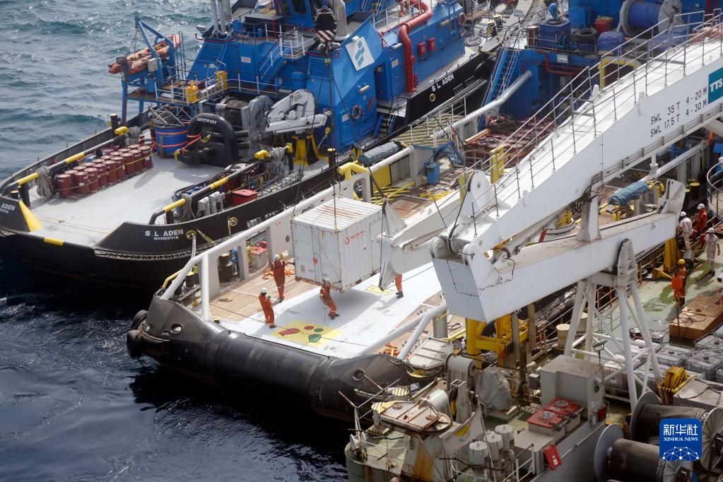 這是6月12日在也門荷臺達附近海域拍攝的聯合國工程船。