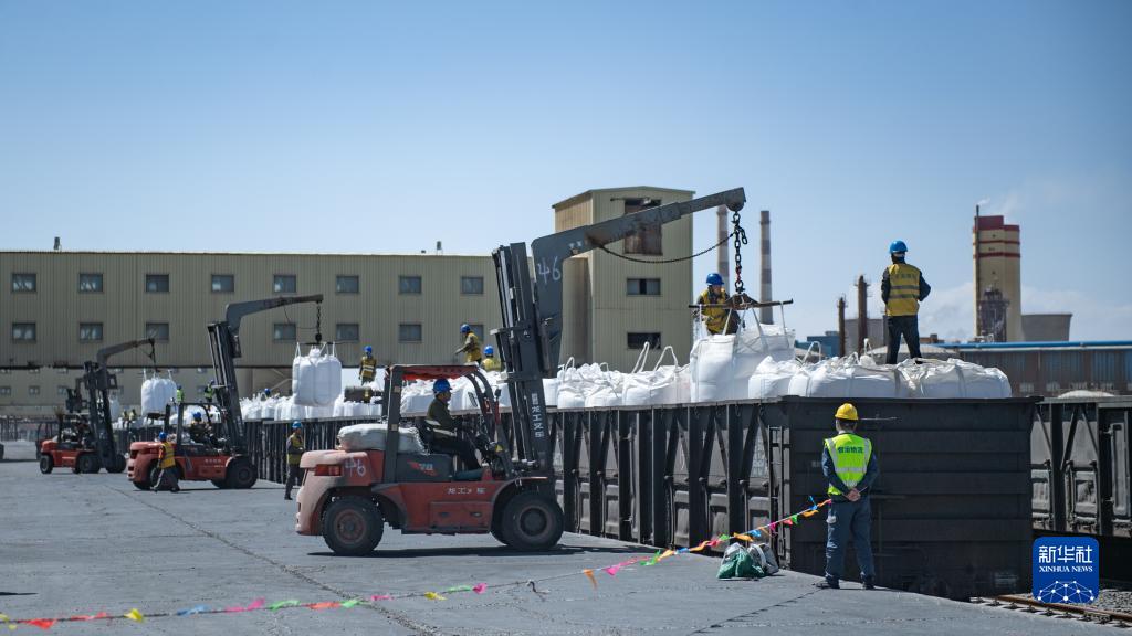 6月12日,在青海鹽湖工業(yè)股份有限公司鉀肥分公司貨場(chǎng),工作人員在裝運(yùn)鉀肥。