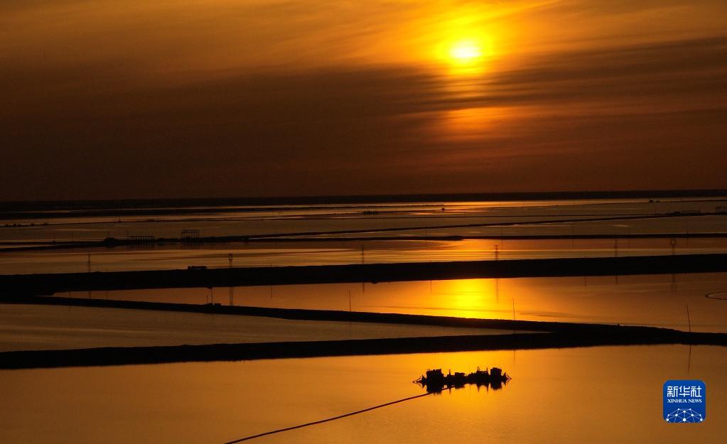 這是6月8日在察爾汗鹽湖拍攝的一艘采鹽船(無人機照片)。
