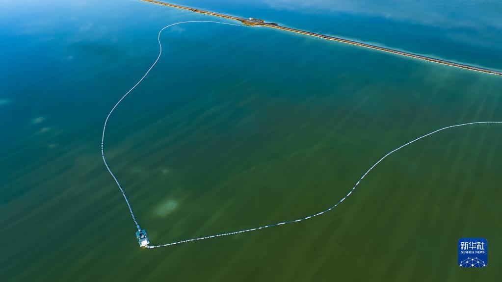 這是6月8日在察爾汗鹽湖拍攝的一艘采鹽船(無人機照片)。
