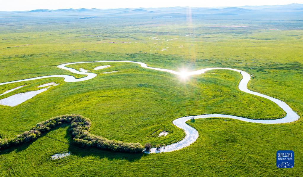 初夏時節,位于內蒙古自治區錫林郭勒盟東北部的烏拉蓋草原風景宜人,蔚藍色的天幕下,綠色的草原廣闊無垠,蜿蜒流淌的烏拉蓋河綿延向遠方,美如畫卷。