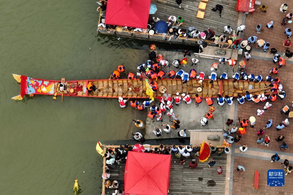 6月13日,在莆田木蘭溪畔舉行的端午節(jié)龍舟傳統(tǒng)祭江儀式現(xiàn)場,一艘龍舟下水(無人機照片)。