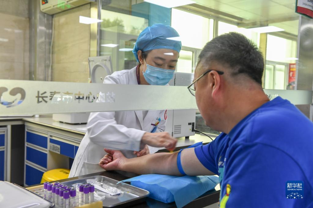 6月13日,在長春市中心血站,RH陰性血無償獻血志愿者李揚帆(右)進行獻血前的血液檢測。