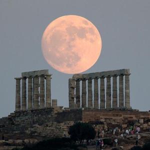 7月2日,一輪滿月出現(xiàn)在希臘蘇尼翁的海神廟遺址上空。