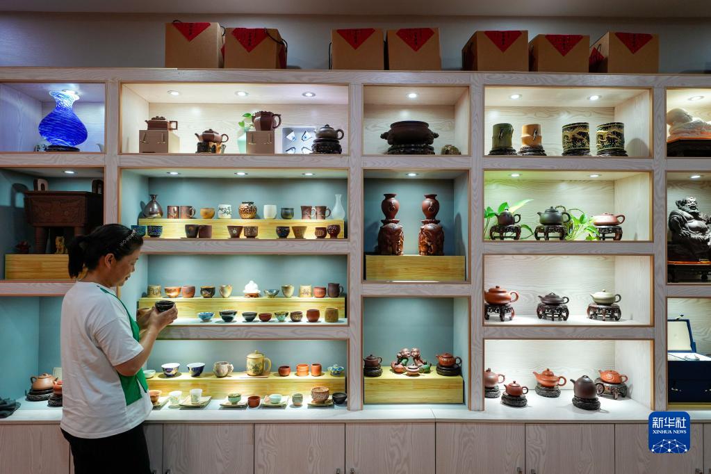 啟新1889文化創(chuàng)意產(chǎn)業(yè)園一家商鋪的工作人員在整理文創(chuàng)產(chǎn)品(7月2日攝)。