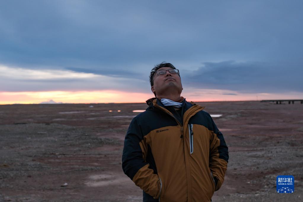 6月16日凌晨,連新明團(tuán)隊(duì)在青藏公路楚瑪爾河大橋附近監(jiān)測(cè)藏羚羊遷徙途中的夜宿地,連新明抬頭觀察無(wú)人機(jī)飛行情況。