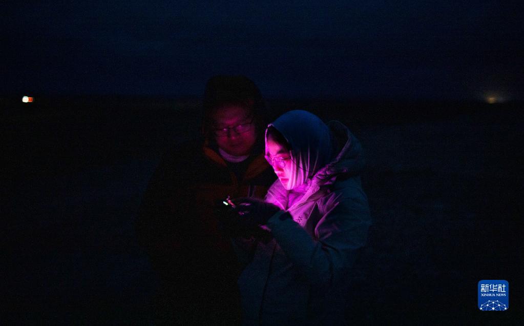 6月16日凌晨,連新明(左)和學生王子涵在青藏公路楚瑪爾河大橋附近,使用無人機監(jiān)測藏羚羊遷徙途中的夜宿地。