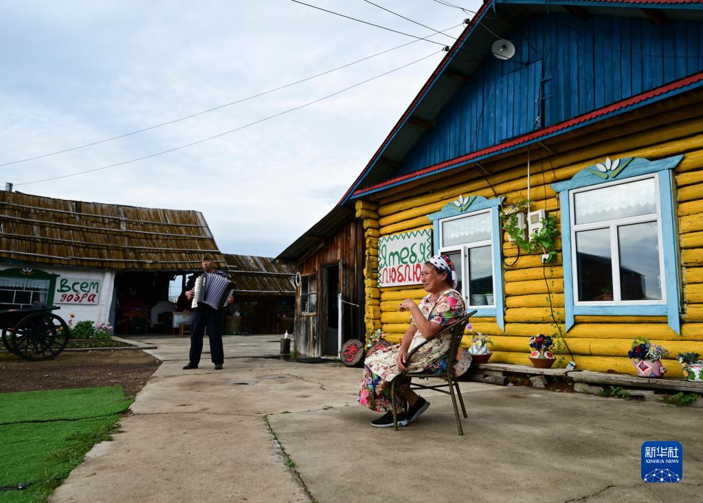 6月28日,考占花(右)坐在庭院里,薩沙在拉手風(fēng)琴。考占花是薩沙的嫂子。