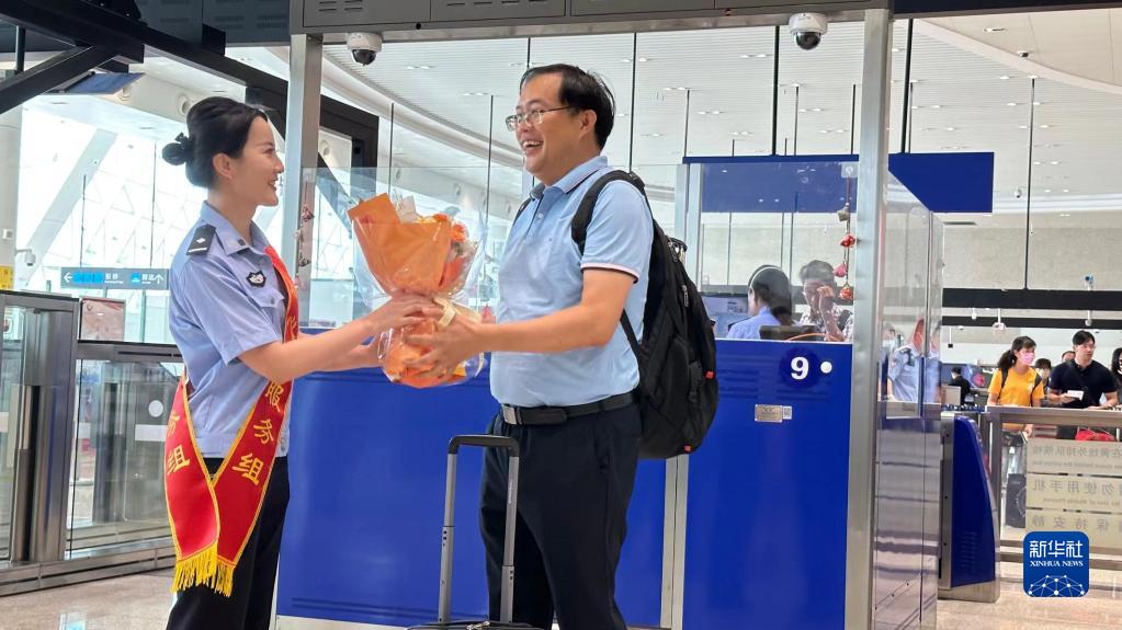 7月4日上午,廈門高崎邊檢站工作人員向廈金航線第2000萬名旅客蔡弼凱(右)贈(zèng)送鮮花。