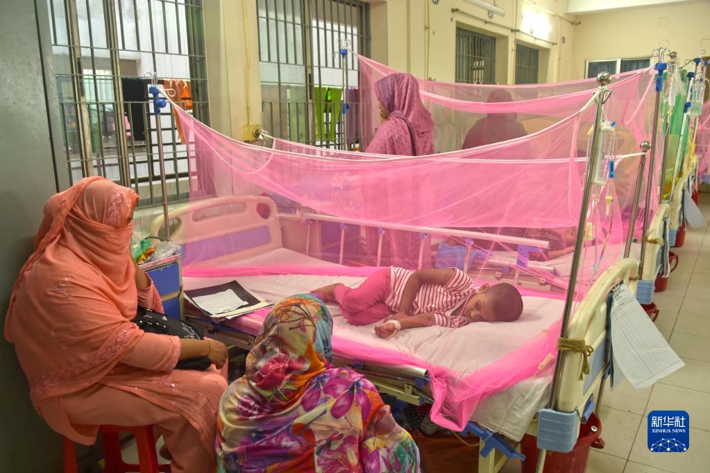 7月4日,在孟加拉國(guó)達(dá)卡一處醫(yī)院,登革熱患者在蚊帳里接受治療。